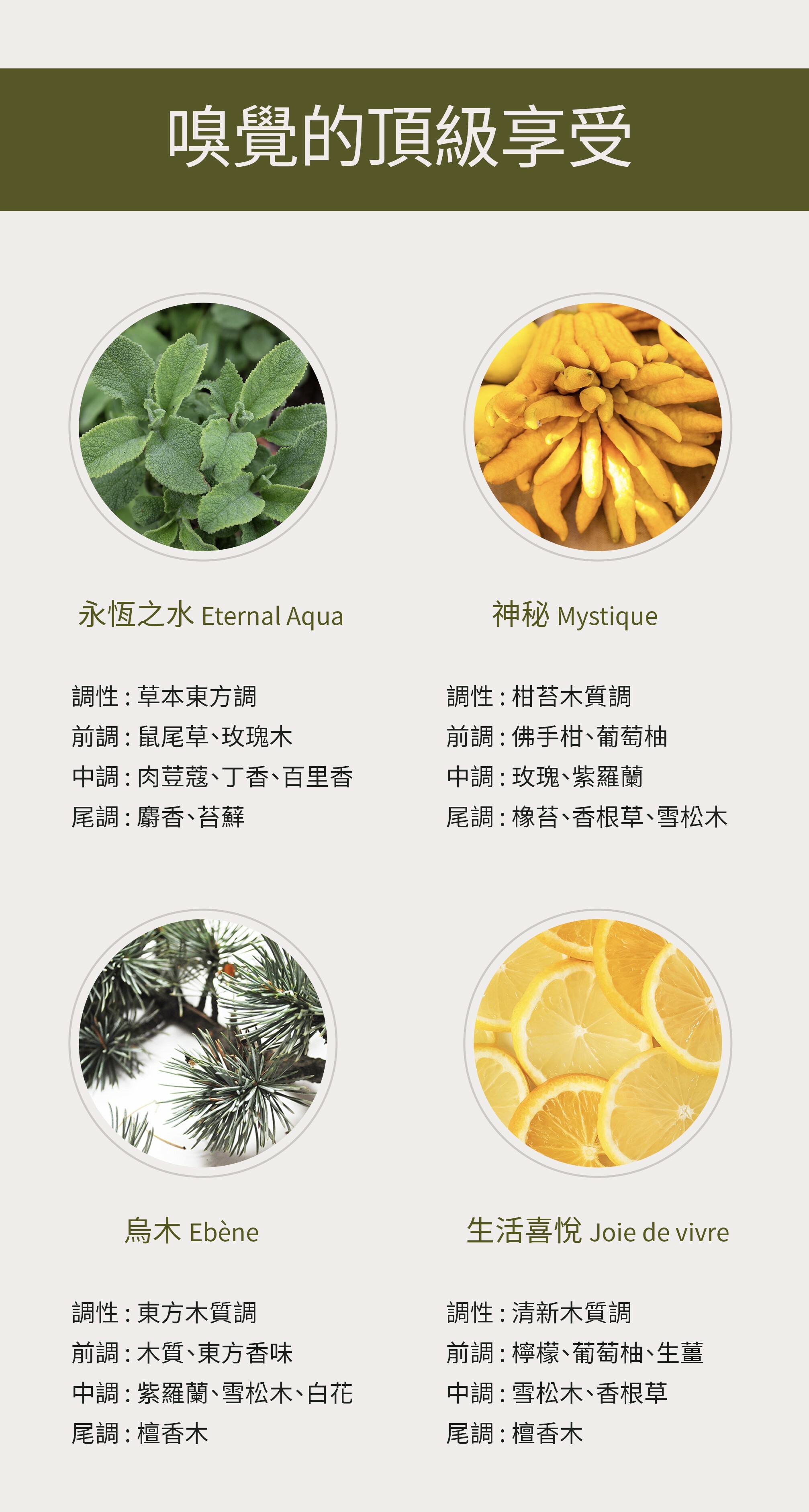 精製香調|多種迷人香氣都來自香水之都-格拉斯的調香師所精心調配。