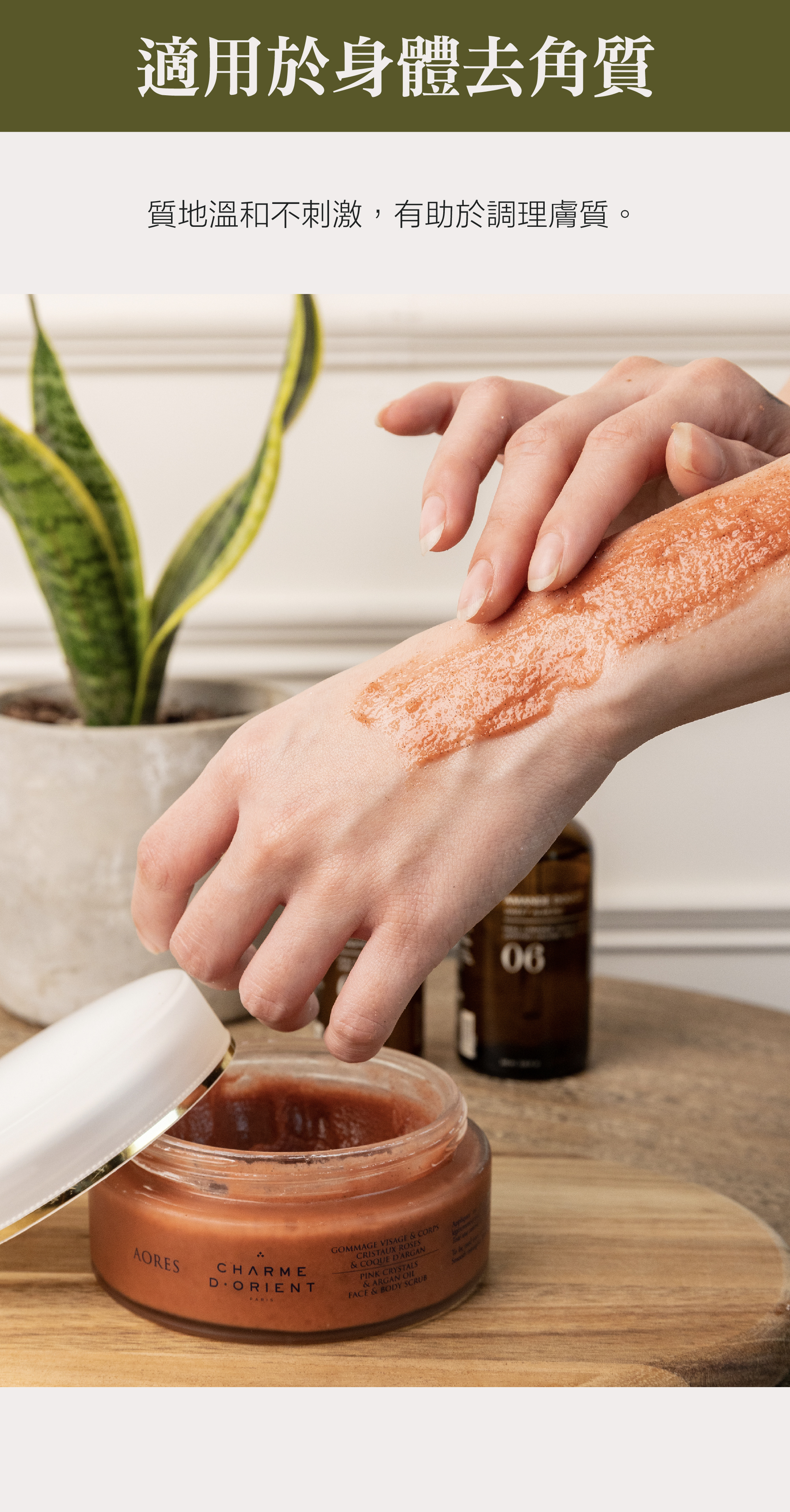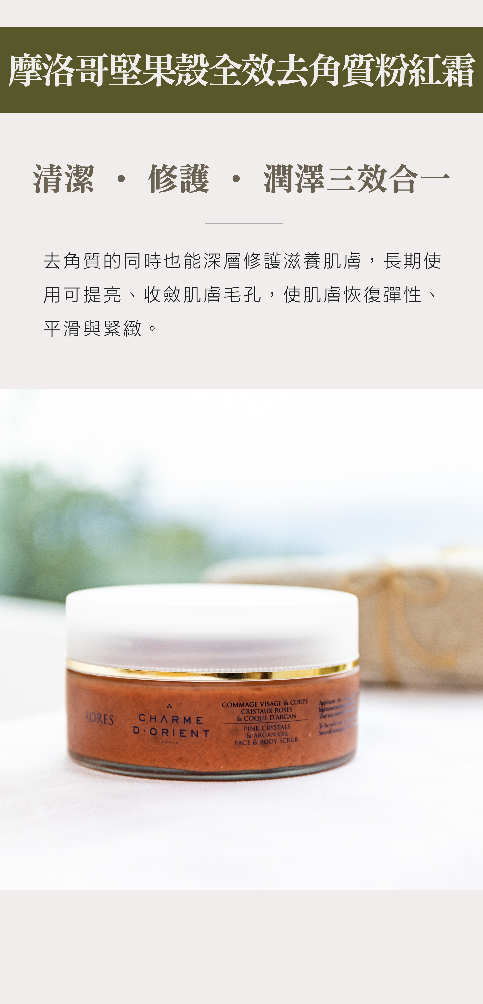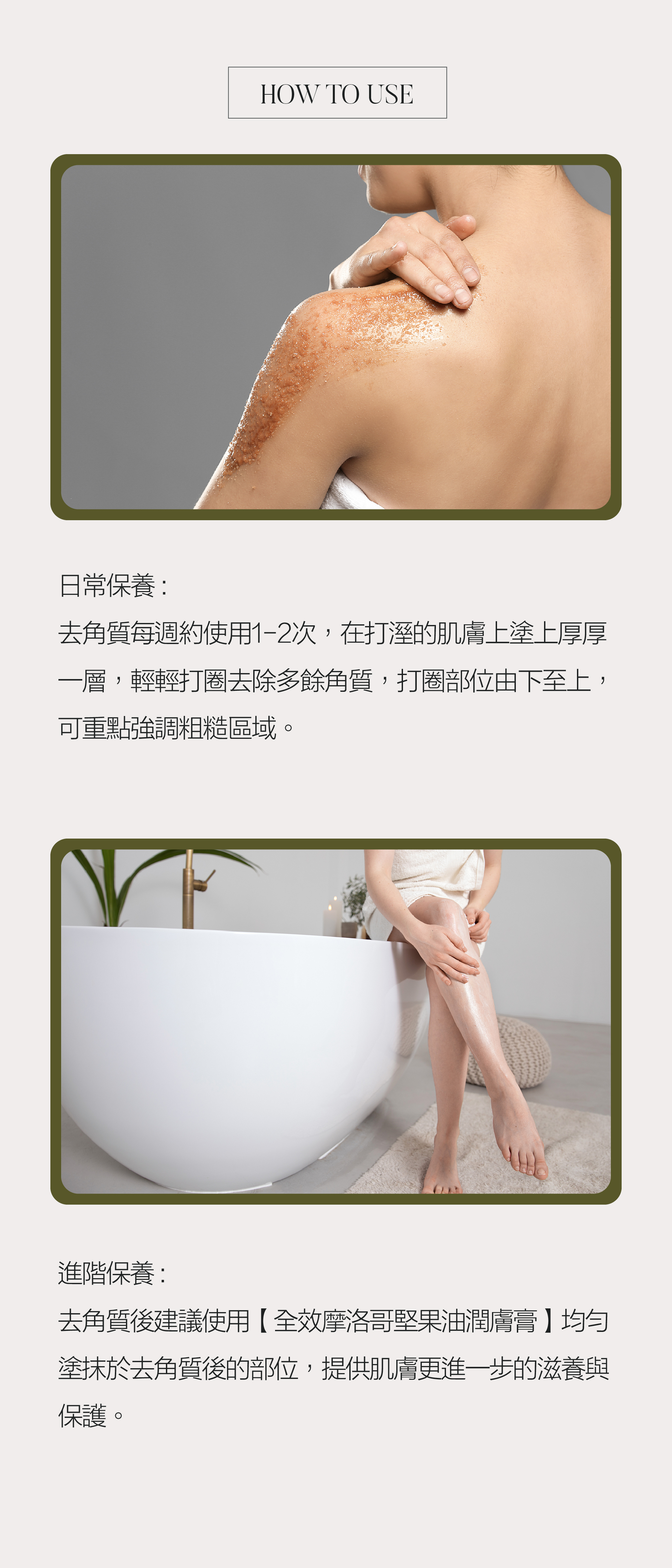 溫和質地|極細緻摩洛哥堅果殼及糖晶體,可輕柔的去除肌膚老廢角質。