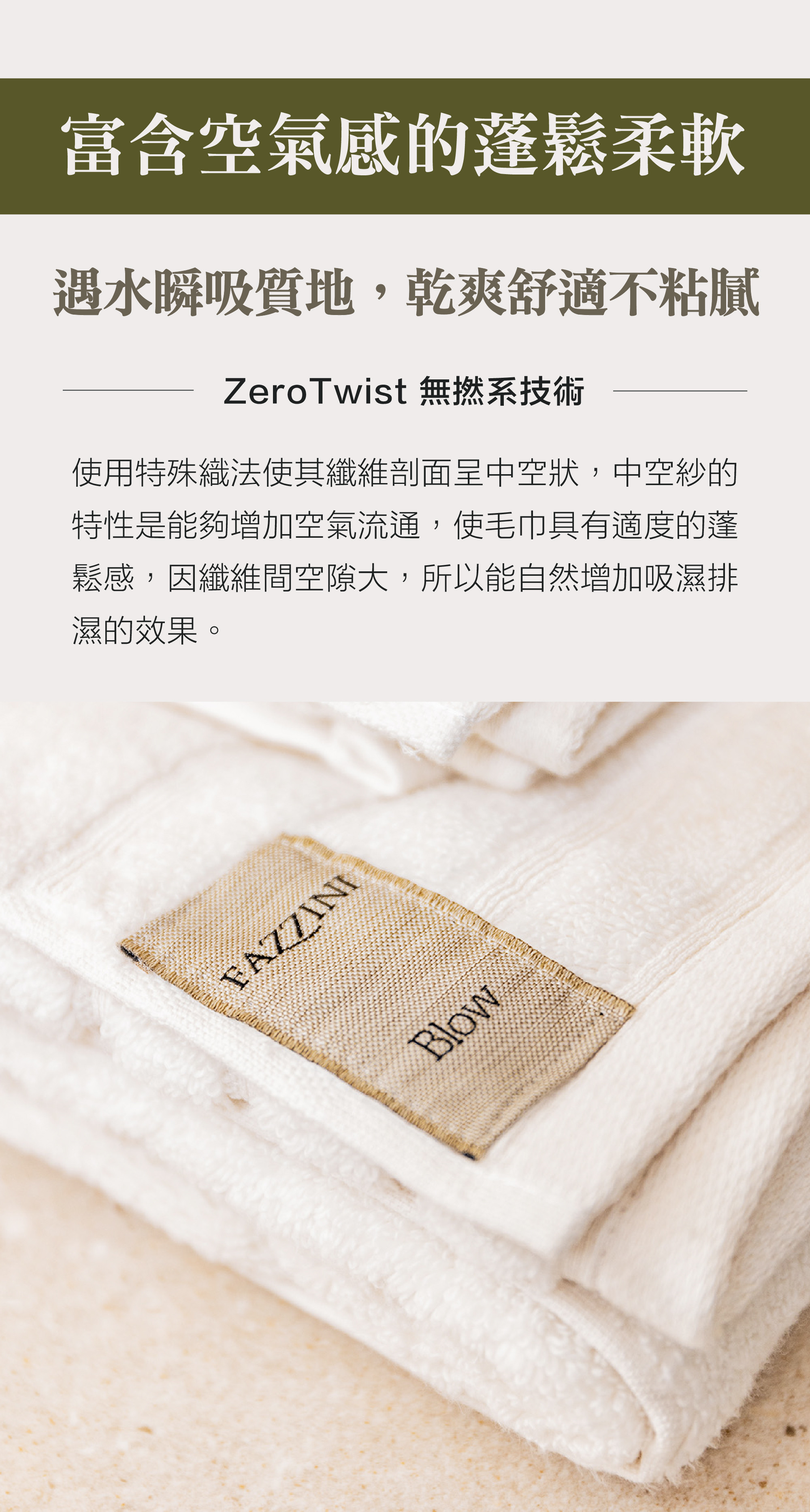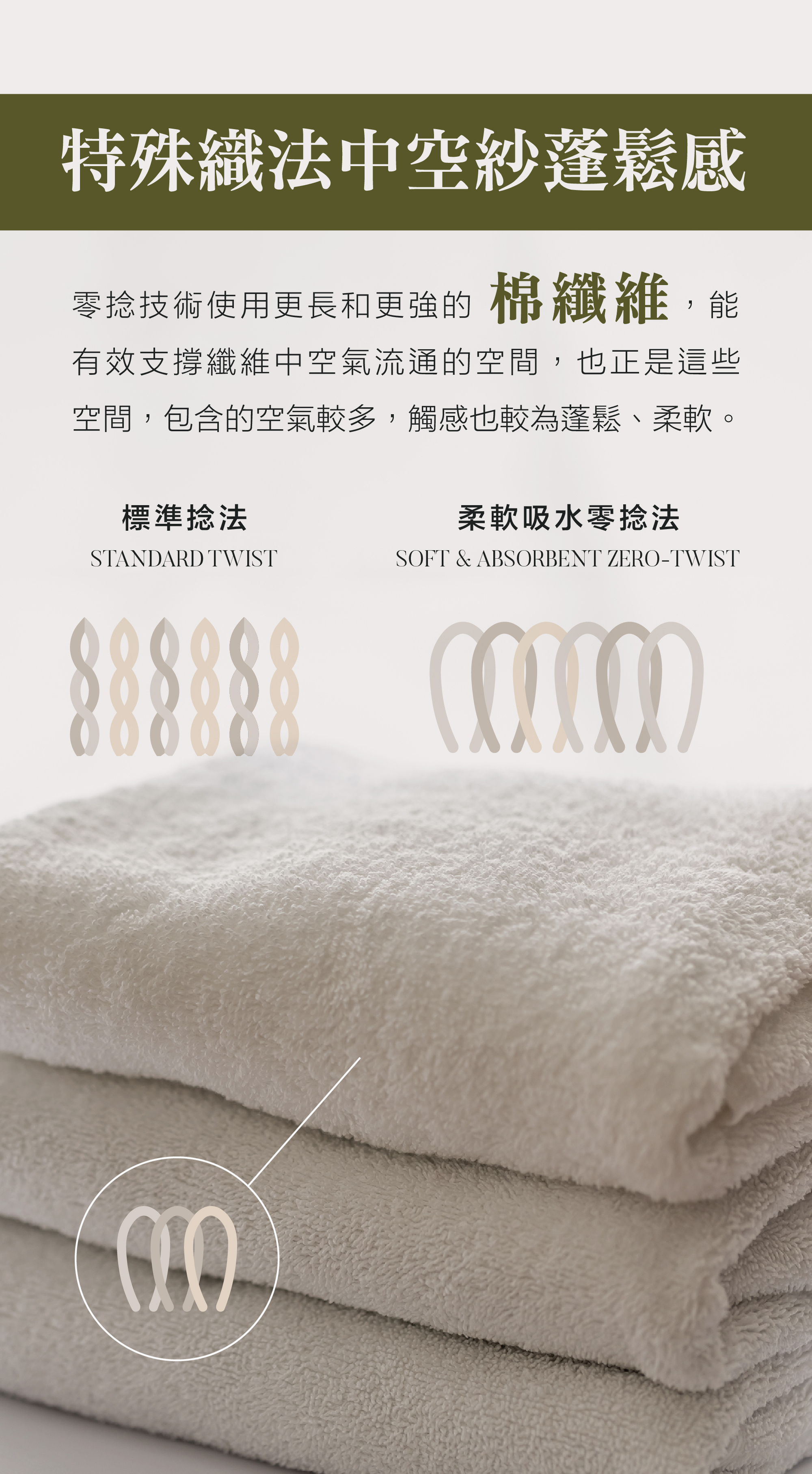 技術創新︱Zero-twist 特殊的織法使纖維剖面呈中空狀,提高空氣流通,賦予毛巾蓬鬆感,帶來獨特的柔棉觸感。