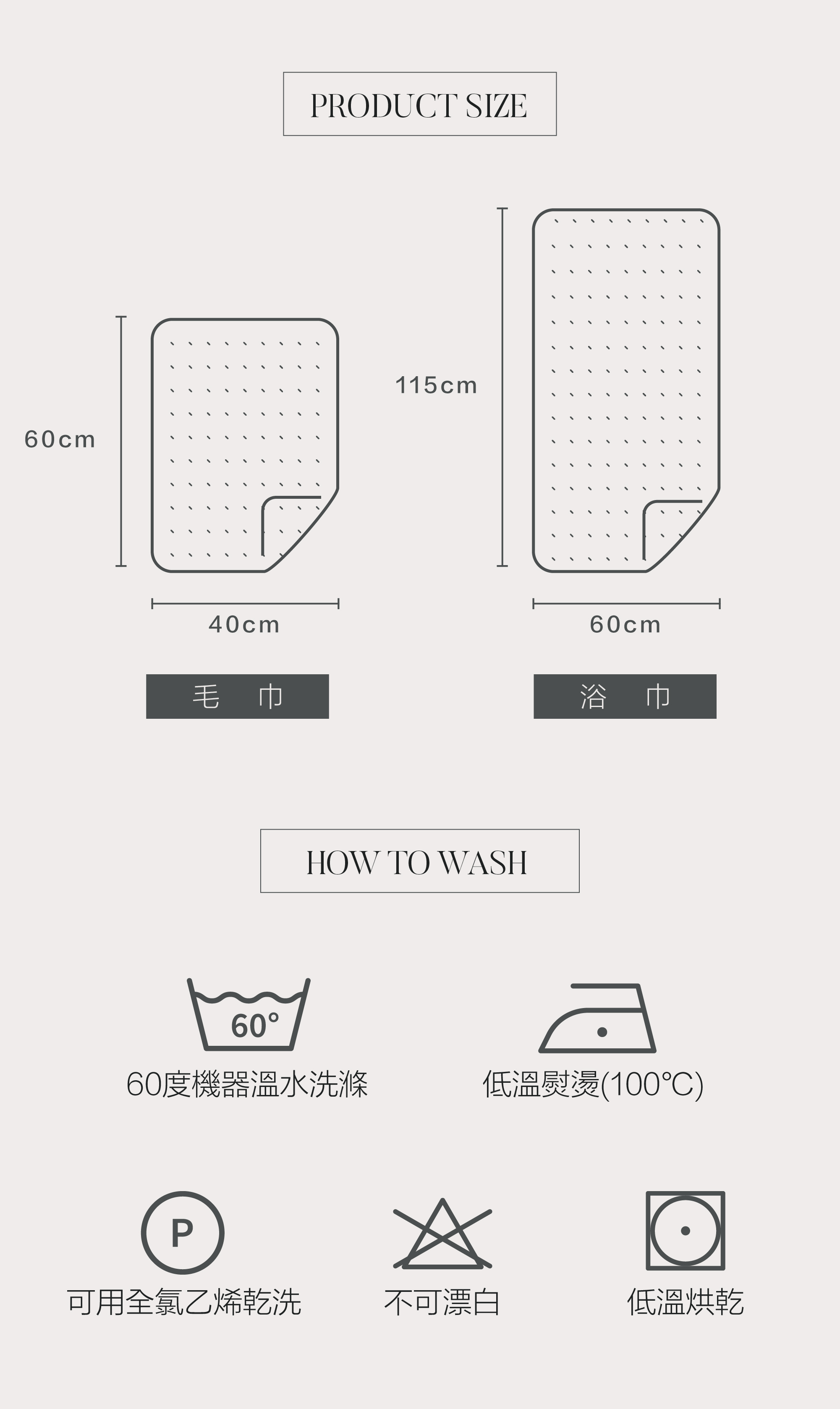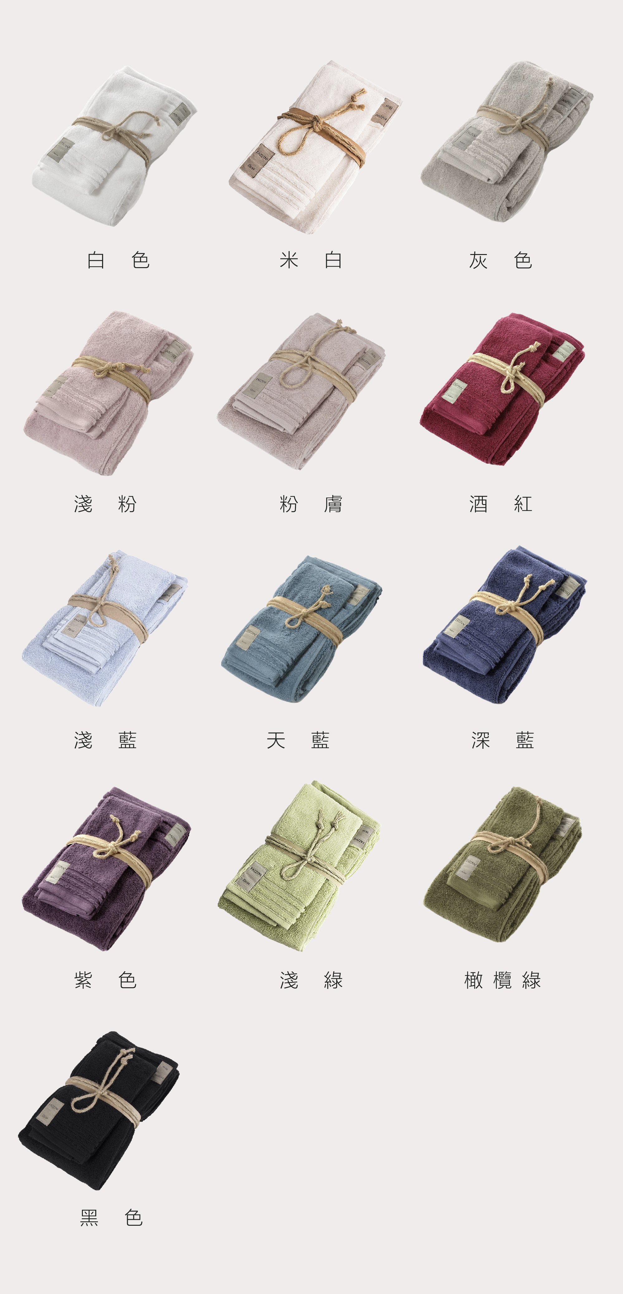 時尚實用︱40x60 cm 的毛巾搭配 60x115 cm 的浴巾。繽紛色彩選擇和實用的兩種尺寸兼顧時尚和便利性,為您的生活增添舒適的高級質感。